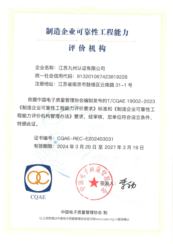 制造企業(yè)可靠性工程能力評價機構(gòu)證書